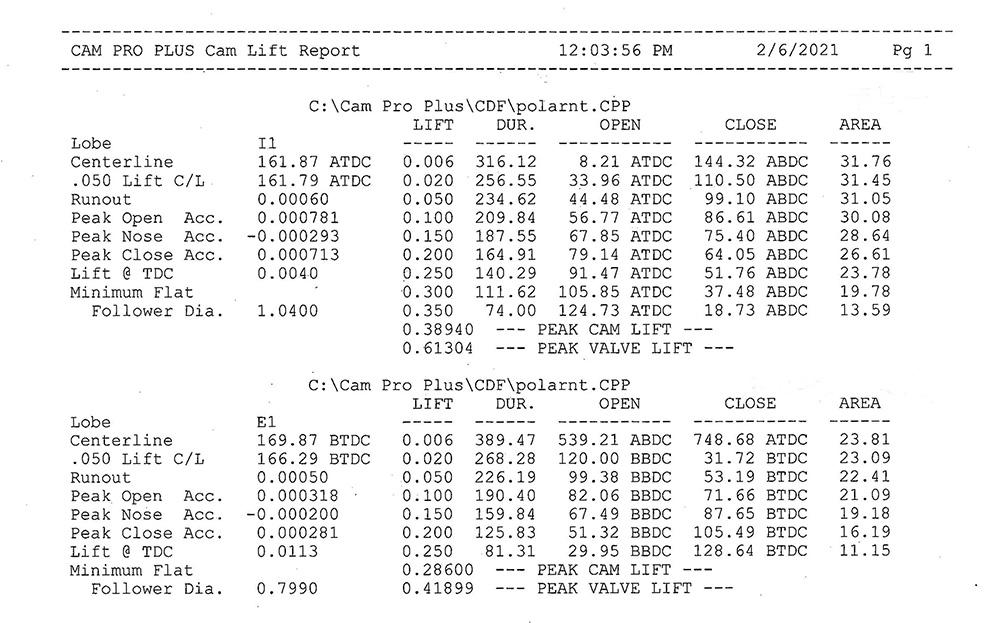 Full computerized cam lobe(s) checkout of duration, lift, ramp rates and other criteria